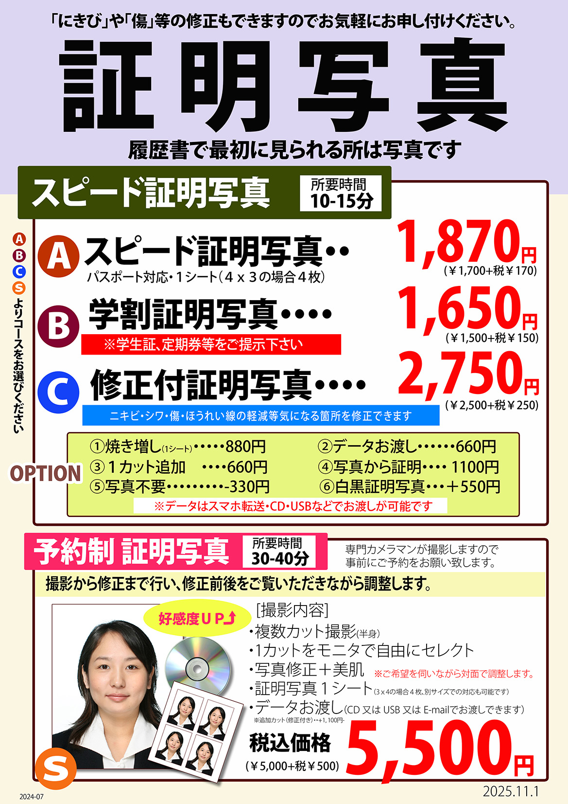 S:予約制証明写真(電話予約のみ)※お早目のご予約をお勧めします。